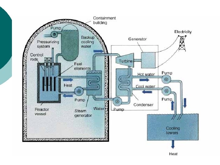 How does a Nuclear Power Plant Operate? a. Water moderator: slows down neutrons b. Neutron-absorbing material- control rod c. Fuel Rodsapproximately one third replaced each year d. Heat transfer system e. Cooling system f. Redundant safety systems
