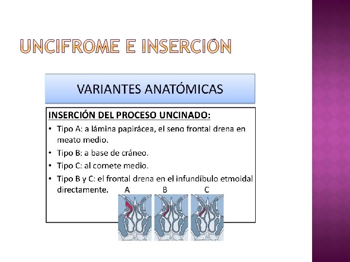 � Inserción del extremo superior del proceso unciforme en la lámina papirácea. � El seno frontal y el infundíbulo etmoidal drenan separadamente seno frontal drena más medial.