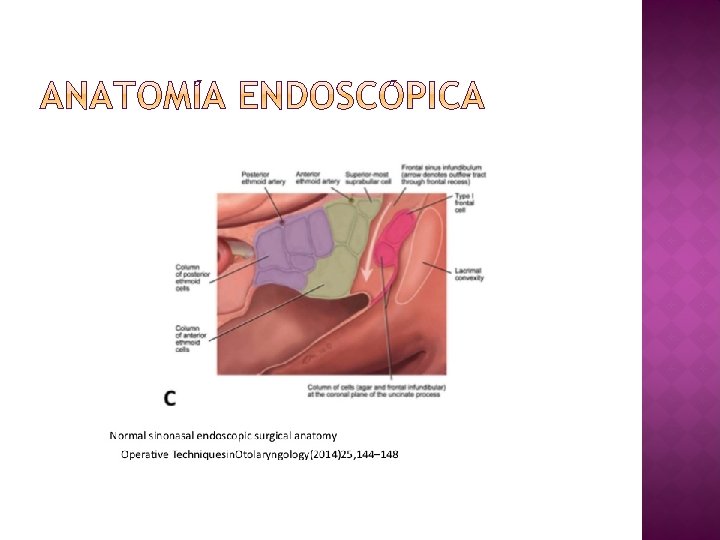 � Infundíbulo etmoidal � Espacio lateral a la apófisis unciforme y medial a la lámina papirácea. � Su tamaño varía según la inserción superior de la AU. LP: receso terminal