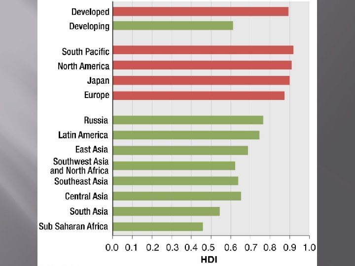 The HDI ranks countries on a scale from 0 (very undeveloped) to 1. 0 (very developed). Countries over. 8 are called More Developed Countries (MDCs), while those under. 8 are called Less Developed Countries (LDCs).
