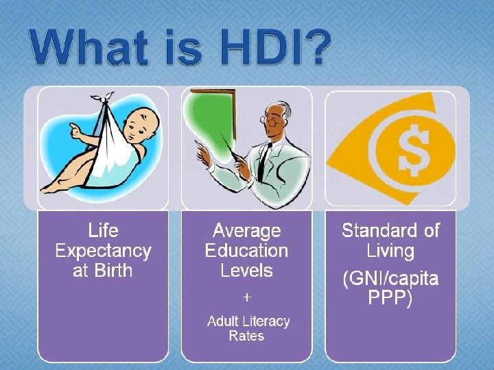 To measure the level of development in different countries, the UN as developed a ranking called the HUMAN DEVELOPMENT INDEX (HDI). The HDI ranks countries according to three key