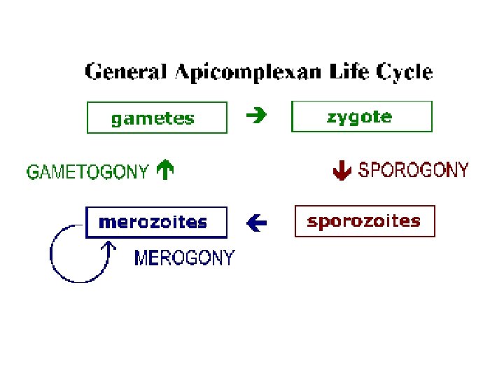 trophozoites Merogony (schizogony) Oocysts (sporozoites) sporogony zygote gametogony gametes merozoites