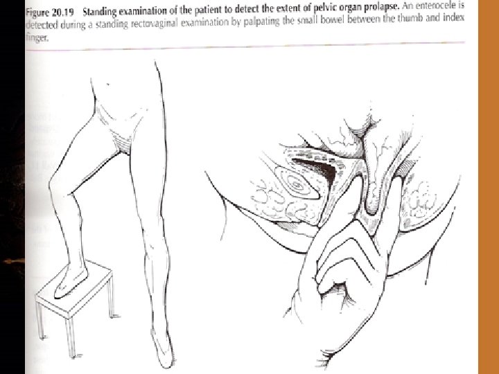 KLİNİK BULGULAR l Prolabe olan organa göre yakınmalar değişebilir: l perinede şişlik, l vajinada baskı hissi, l üriner fonksiyon bozukluğu, l defekasyon bozuklukları, l seksüel fonksiyon bozuklukları, l pelvik ağrı, l bel ağrısı,