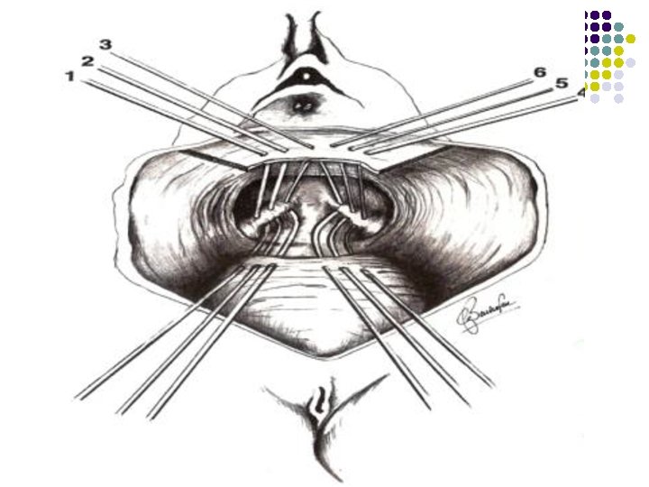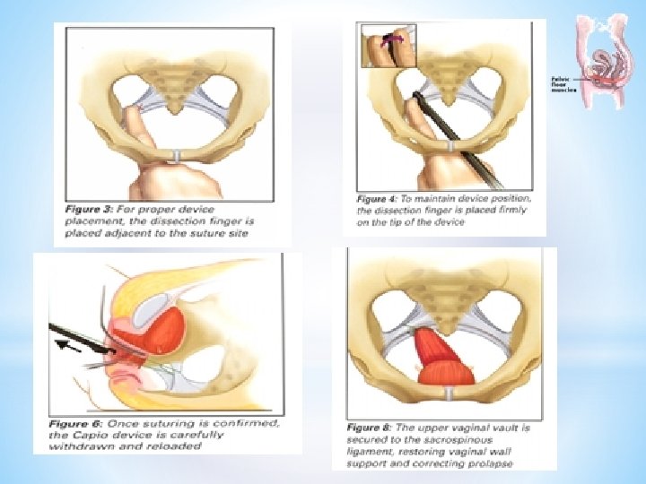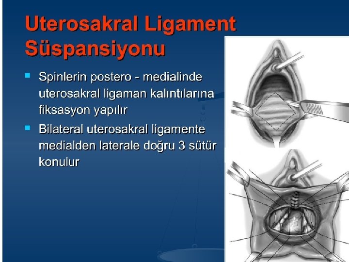 UTEROSAKRAL LİGAMENT SÜSPANSİYONU l ULS ‘nun popüleritesi artmaktadır. Başarı oranı % 90 98 olarak bildirilmektedir l Uterosakral ligament üst vaginanın ana desteğidir. l Teknik: l Peritoneal kaviteye girilir ve UL bulunur, klemp ile tutulur, l Her iki tarafta spina iliacanın 1, 5 cm medialinde 2 -3 kalıcı sütür atılır. l Sütürler ön ve arka vagenden çıkarılır ve bağlanır.