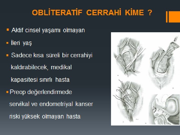 TOTAL KOLPOKLEZİS Vajina mukozası tamamen çıkartılır. l Sirküler şekilde sütürlerle vajina kapatılır. l