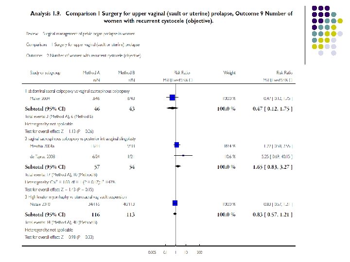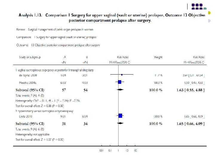 Tek taraflı veya iki taraflı sakrospinöz tespitin rolü nedir? l Tek veya iki taraflı sakrospinöz fiksasyon tavsiye etmek hiçbir kanıt yoktur Retrospektif 22 bil SSF post isterektomize apikal kuf prolapsusunda yapılmış 16 sının değerlendirilmesinde(%73)çalışma değerlendirildi. 16 kadında uygunluk gösterdiği, 20 -30 dakika daha uzun süre, 25 -50 ml fazla kan kaybı görülmüş, çalışmalar 4 -40 hafta izlenmiştir. hic birinde rekürrens gelişmemiş, 3 kadında /%18. 8 inde)anterior vaginal duvar prolapsusu gelişmiştir. Randomize karşılaştırma literatürde yoktur.