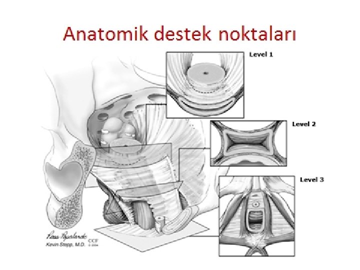 PELVİK DESTEK DÜZEYLERİ l l 1. Düzey: l Sakrouterin Ligamanlar l Kardinal ligamanlar 2. Düzey: l Arcus tendineus fasya pelvis, l Levator ani, l Puboservikal fasya, l l Rektovajinal fasya Uterin proplapsus Vajen kubbe prolapsusu Sistosel Paravajinal defekt Rektosel Enterosel 3. Düzey: l Perineal ‘body’, l Üretra Distal rektosel Cinsel disfonksiyon