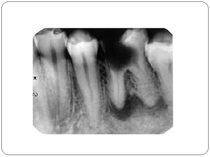 II. Chronische Apikale Parodontitis �Symptome: Langsamer Verlauf. Keine Schmerzen, Devitalität des betroffenen Zahnes. �Ursache: Infektion über den Wurzelkanal eines pulpentoten Zahnes �Röntgen: Im Röntgenbild apikale Aufhellung oder Parodontalspaltverbreiterung. +Knochensklero se/ Knochenverdünnung