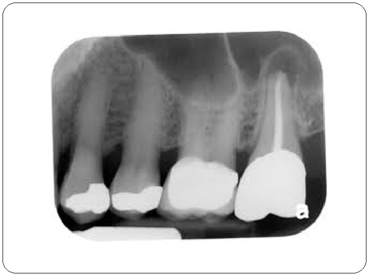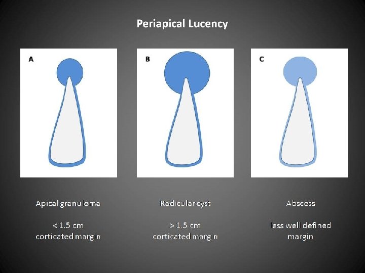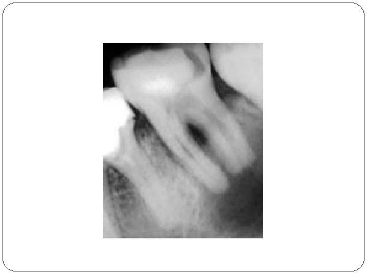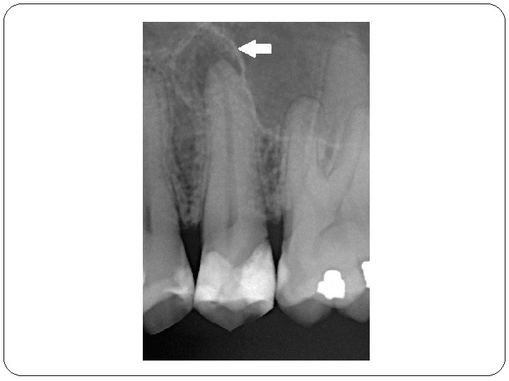 II/C Abcessus periapicale chronica �abgekapselte Ansammlung von Eiter �Symptome: spontaner Zahnschmerz, Perkussionsschmerz Fistula, Gaumenschwellung Eiterbeule an der Gaumen �Röntgen: Irregulare und unscharfe Grenze, Aufhellung, (Granuloma und Zyst sind dunkler)
