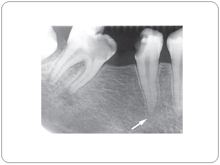 I. Akute Apikale Parodontitis � PRIMER Symptome: Akute Entzündung in der Umgebung der Wurzelspitze. Dauerschmerz in der Umgebung des Zahnes, Perkussionsschmerz, Der Patient hat das Gefühl, der Zahn sei länger geworden. Ursache: Pulpitis, Trauma, Caries, Wurzelbehandlung Röntgen: Im Röntgenbild bietet die primär-akute apikale Parodontitis zunächst keine Veränderungen. Nach einigen Tagen wird der durch die Entzündung ausgelöste Knochenabbau als diffuse Aufhellung in der Umgebung der Wurzelspitze erkennbar. + Periodontale Spalt ist breiter. � SEKUNDER Symptome: Akute Exazerbation einer primär-apikalen Parodontitis. Röntgen: Ähnlich wie chronische apikale Parodontitis
