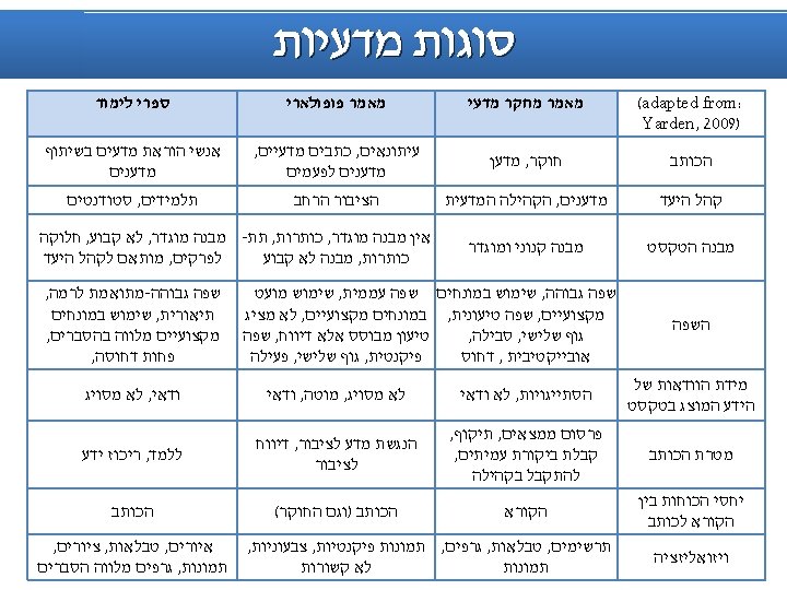 (APL) מאמר מעובד - סוגות מדעיות Research articles (PSL) Popular articles Textbooks APL Source of information (Writers) Scientists (first -hand) Journalists (second-hand) Science educators and scientists Target audience (readers) The scientific community Non-scientists (general public) Students Non-canonical Canonical (IMRD) Various degrees of certainty, with minimum evidence to support conclusions Certain, with minimum evidence to support conclusions Uncertain, using evidence to support conclusions Structure Canonical (IMRD) Presentation Uncertain, using evidence to of science support conclusions Writers' purpose To get claims accepted by the scientific community To report about new scientific discoveries To explain and To enable the use of summarize known research articles for and accepted learning biology in scientific knowledge secondary school