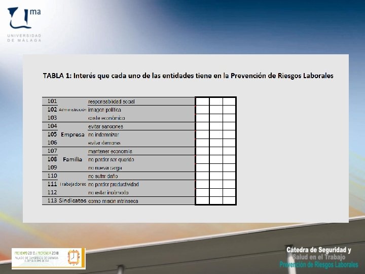 Autores: • • José V. MAESO ESCUDERO, de la Universidad de Málaga Antonio GARCÍA RODRÍGUEZ, de la Universidad de Málaga Carlos A. BENAVIDES VELASCO, de la Universidad de Málaga Enrique GEA IZQUIERDO, de la Escuela Andaluza de Salud Pública Agradecimientos: • • Consejería de Empleo de la Junta de Andalucía, por la subvención de este trabajo. Fundación Grupo Séneca, por financiar la Cátedra.