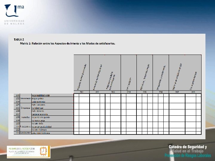 MATRIZ 1 Administración responsabilidad social imagen política menor coste económico Empresa evitar sanciones CLIENTES QUÉ quieren estos clientes no indemnizar evitar demoras Familia mantener economia no perder ser querido no nueva carga (incapacidad, enfermedad) Trabajadores no sufrir daño no perder prodctividad no estar incomodo Sindicatos como fruto de su misión