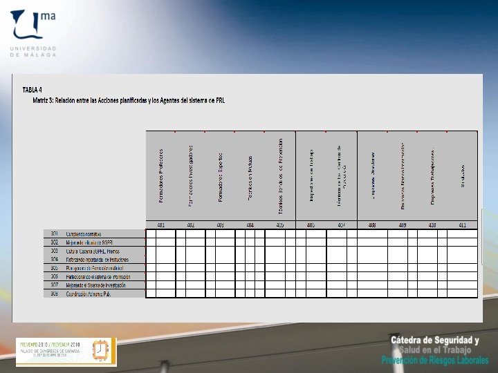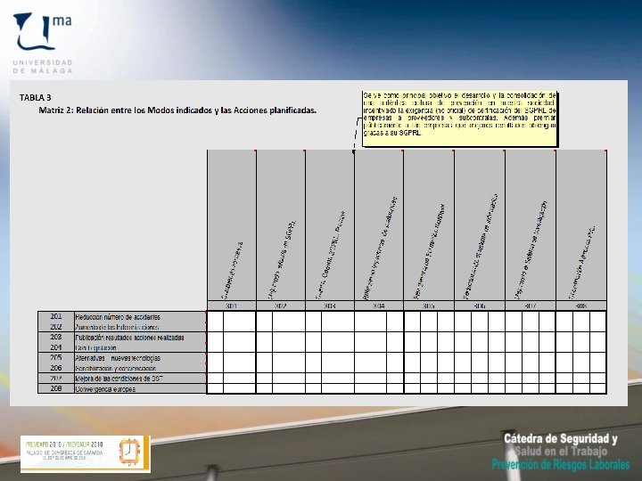 MATRIZ 3 QUÉ (Planes de acción) Cumpliendo normativa Mejorando eficacia de SGPRL Cultura. Cadena SGPRL. Premios Reforzando importancia de Instituciones Plan general de Formación multinivel Perfeccionando el sistema de Información Mejorando el Sistema de Investigación