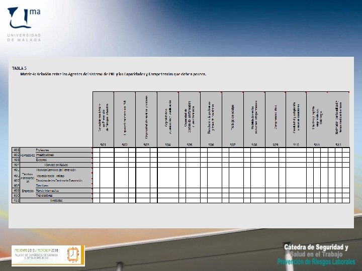 MATRIZ 4 CÓMO (Competencias profesionales y destrezas genericas) Profesionales Especificas Conocimientos básicos en Prevencion de Riesgos Laborales Especializaciones en PRL Temas Transversales , Legislación , Gestión Etc. Instrumentales Capacidad de análisis y síntesis Capacidad de organización y planificación Capacidad de gestión de la información y uso informatica Resolución de problemas y toma de decisiones Personales Trabajo en equipo Habilidades en las relaciones interpersonales Conocimiento de otras culturas y costumbres Compromiso ético Sistémicas Creatividad y adaptacion a nuevas situaciones Iniciativa y espiritu emprendedor. Liderazgo Motivación por la calidad y temas mediambientales