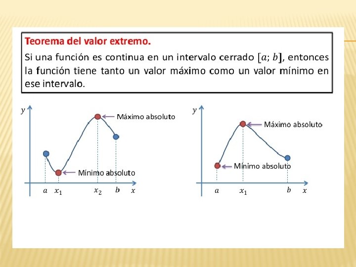 TEOREMA DEL VALOR EXTREMO Si una función f es continua en un intervalo cerrado [a, b], entonces la función tiene un valor máximo absoluto y un valor mínimo absoluto en el intervalo cerrado [a, b]. Este valor máximo o valor mínimo puede ocurrir en los valores x = a, o x = b o en cualquiera de los números críticos de la función f.