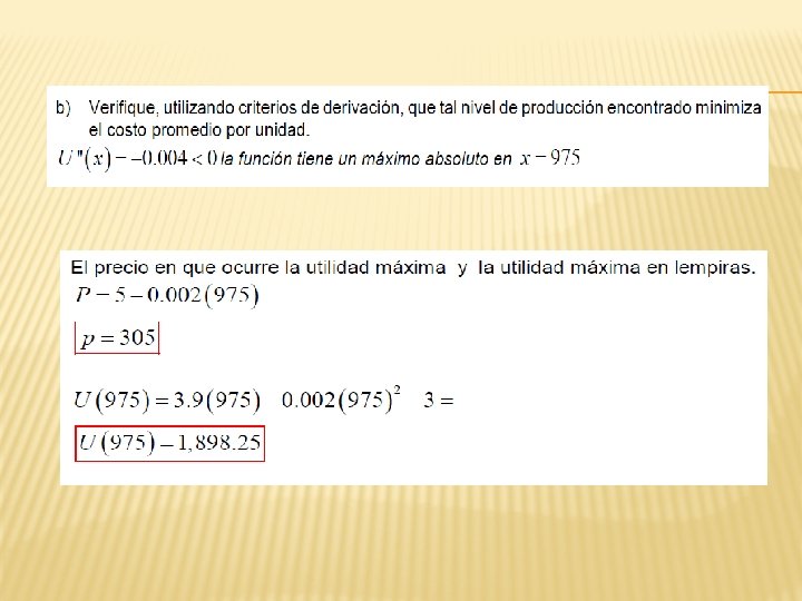 b) Utilice criterios de derivación para verificar que tal valor encontrado en el inciso anterior realmente maximiza la utilidad. b) Criterio de la segunda derivada El valor máximo absoluto de la función de utilidad ocurre en x = 5.