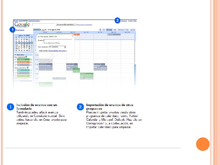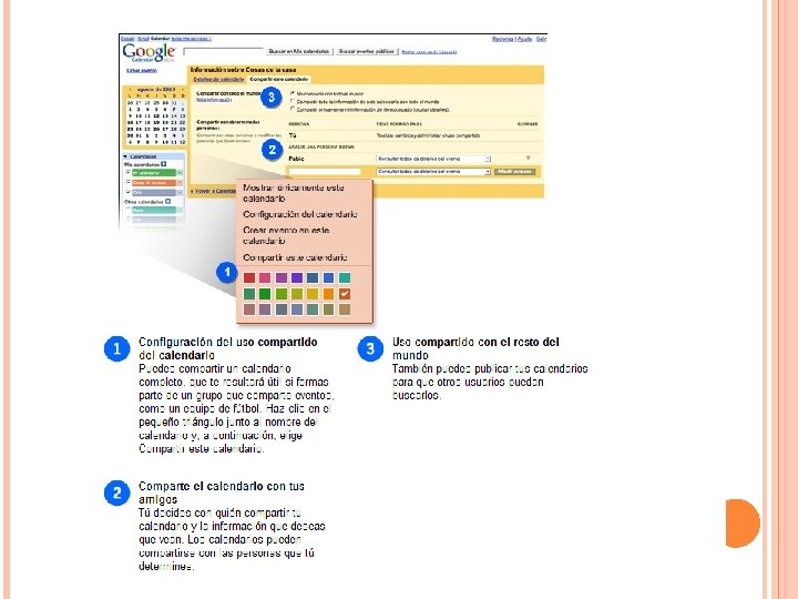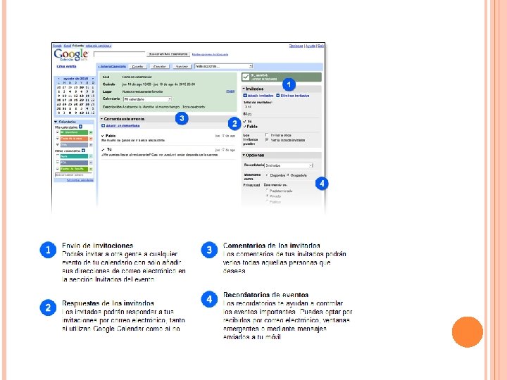 Google calendar Permite crear calendarios propios, y siguiendo la filosofía de la Web 2. 0, compartirlos con otros usuarios. Tiene múltiples funciones: Crear eventos y editarlos Establecer avisos Maneja varios calendarios simultáneamente, estableciendo niveles de privacidad y seguridad.