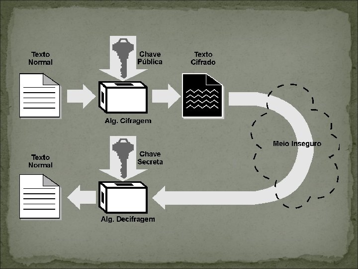 Chave assimétrica: � Utilização de chaves diferentes para cifrar e decifrar. Emissor e receptor possuem duas chaves, uma pública que pode ser divulgada e outra privada que deve ser mantida em segredo. � Emissor envia mensagem criptografada através da chave pública do receptor. A chave esta disponível para qualquer pessoa. O receptor recebe a mensagem e a decriptografa utilizando a sua chave privada(somente ele conhece). Se quiser responder deverá fazer o mesmo, a diferença é que dessa vez a chave pública do emissor será utilizada. � O emissor de posse de sua chave privada, somente ele poderá decifrar a mensagem, garantindo assim o sigilo. A grande vantagem é que não só emissor pode enviar mensagens criptografadas para receptor, mas qualquer pessoa, basta conhecer a chave pública deste receptor, além disto, emissor e receptor não precisam combinar chaves antecipadamente.