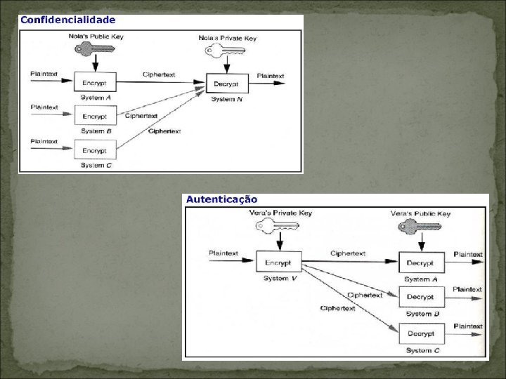 Confidencialidade, Autenticidade e Integridade � Emissor envia uma mensagem, primeiramente criptografa através de sua chave privada(assinando a mensagem) e logo após criptografa a mensagem com a chave pública do receptor(tornando-a sigilosa), isto é o emissor envia a mensagem duplamente criptografa para receptor, este por sua vez ao receber a mensagem deverá decriptografa duas vezes. Primeiro com sua chave privada e depois com a chave publica do emissor. � O maior problema das chaves assimétricas é que ela é computacionalmente intensiva, sendo necessário muito tempo para criptografar uns poucos parágrafos. � Um algoritmo que faz criptografia assimétrica é o RSA, e um exemplo de aplicativo que a utilize é o PGP que possibilita correio eletrônico criptografa.