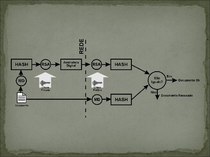 Assinatura Digital � A assinatura digital é uma garantia que o documento é uma cópia verdadeira e correta do original. � Com chaves assimétrica. Emissor criptografa a mensagem com sua própria chave privada e envia ao receptor. Para decriptografar deve-se usar a chave pública do emissor. Desta forma qualquer pessoa pode ler a mensagem, porém tem-se a certeza de que foi o emissor quem enviou, pois somente ele possui o chave privada. � Para assinar uma mensagem, uma função Message Digest (MD) é usada para processar o documento, produzindo um pequeno pedaço de dados, chamado de hash. Uma MD é uma função matemática que refina toda a informação de um arquivo em um único pedaço de dados de tamanho fixo. Entra-se com os dados a serem "digeridos" e o algoritmo MD gera um hash de 128 ou 160 bits (dependendo do algoritmo, são exemplos: MD 4, MD 5 e Snefru). Uma vez computada uma message digest, criptografa-se o hash gerado com uma chave privada. O resultado de todo este procedimento é chamado de assinatura digital da informação.
