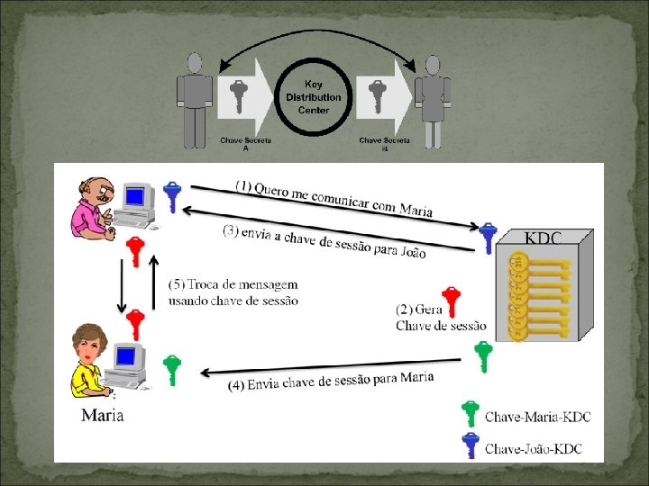 � Se uma pessoa quer se comunicar com outra com segurança, ela deve passar primeiramente a chave utilizada para cifrar a mensagem. Este processo é chamado distribuição de chaves, e como a chave é o principal elemento de segurança para o algoritmo, ela deve ser transmitida por um meio seguro. Porém, se existe um meio seguro de se enviar a chave, por que não enviar a própria mensagem por este meio? A resposta para esta questão é que meios seguros de comunicação são geralmente caros e mais difíceis de serem obtidos e utilizados, sendo então razoável sua utilização uma única vez, mas não continuamente. Se n pessoas querem se comunicar utilizando chave secreta, será necessário (n)(n-1) /2 chaves, gerando um grande problema para o gerenciamento de chaves entre grandes grupos de usuários. Uma das tentativas de solucionar o problema da distribuição das chaves secretas foi a criação de um centro de distribuição de chaves (Key Distribution Center - KDC), que seria responsável pela comunicação entre pessoas aos pares. Para isto, o KDC deve ter consigo todas as chaves secretas dos usuários que utilizam seus serviços. Por exemplo, imagine a situação descrita pela figura, onde A quer mandar uma mensagem secreta para B. Para isto, ele manda a mensagem para o KDC usando sua chave secreta. O KDC recebe esta mensagem, decifrando com a chave secreta de A, depois o KDC a cifra novamente usando agora a chave secreta de B, e a envia para o mesmo. O maior problema em torno do KDC, é que este constitui um componente centralizado, além de ser gerenciado por pessoas que podem, casualmente, serem corrompidas.