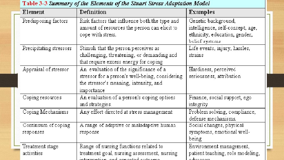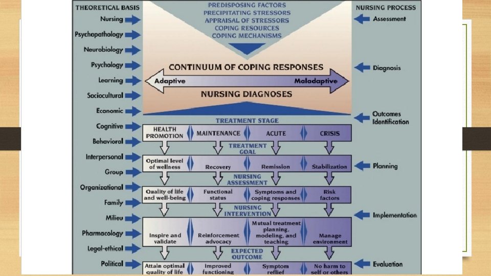NURSING CARE Stuart’s Stress Adaptation Model (2013) Biologis Psikologis Sosiokultur al Lingkungan Legal Etik Spiritual (? ) KOMPLEMEN MEDIK DAN KEPERAWATAN • Seseorang dengan diagnosa medis tertentu dapat berdaptasi dengan penyakitnya ATAU • Seseorang yang tidak ‘sakit’ tapi memiliki koping yang maladaptif . Keperawatan tidak fokus pada penyebab tapi pada RESPON