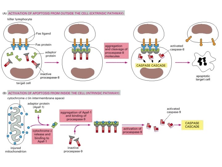 Description of the previous figure • (A) Extracellular activation. A killer lymphocyte carrying the Fas ligand binds and activates Fas proteins on the surface of the target cell. Adaptor proteins bind to the intracellular region of aggregated Fas proteins, causing the aggregation of procaspase-8 molecules. These then cleave one another to initiate the caspase cascade. • (B) Intracellular activation. Mitochondria release cytochrome c, which binds to and causes the aggregation of the adaptor protein Apaf-1 binds and aggregates procaspase-9 molecules, which leads to thecleavage of these molecules and the triggering of a caspase cascade. Other proteins that contribute to apoptosis are also released from the mitochondrial intermembrane space (not shown).