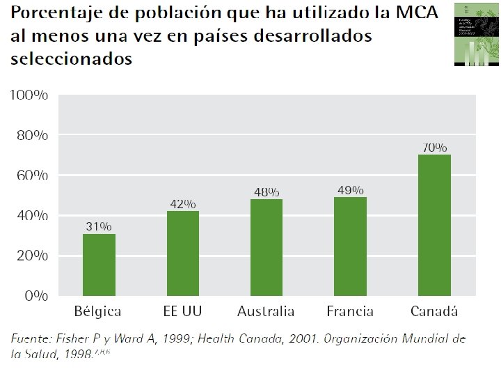 Un enfoque alternativo o complementario para la sanidad en los países desarrollados l l En muchos países desarrollados, el uso cada vez mayor de la MCA indica que existen otros factores aparte de la tradición y el coste. La preocupación sobre los efectos adversos de los fármacos químicos, las cuestiones asociadas con los enfoques y suposiciones de la medicina alopática, el mayor acceso del público a información sanitaria, los cambios en los valores y la reducida tolerancia del paternalismo son algunos de ellos.