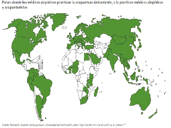 Qué es la acupuntura para la OMS ? l “La acupuntura es un elemento importante de la medicina tradicional china. Se comenzó a utilizar hace más de 2500 años y su teoría ya estaba bastante perfeccionada en tiempos muy remotos, como puede comprobarse en muchas obras clásicas chinas. En el siglo VI se introdujo en los países vecinos, donde se aceptó con facilidad, y a comienzos del siglo XVI ya había llegado a Europa. Durante los dos últimos decenios, la acupuntura se ha difundido en todo el mundo, lo cual ha estimulado el perfeccionamiento de esta terapia, en particular mediante estudios realizados a partir de perspectivas médicas y metodologías de investigación modernas. ”(*) OMS/EDM/TRM/99. 1 / Directrices sobre capacitación básica y seguridad en la acupuntura