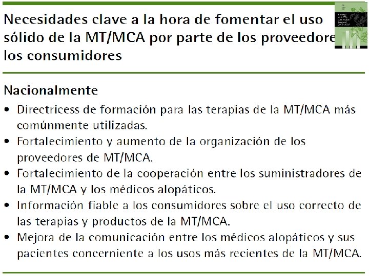 Amplitud y uso creciente l l l La MT se utiliza ampliamente y es un sistema sanitario que está creciendo rápidamente y de gran importancia económica. En África hasta un 80% de la población utiliza la MT para ayudar a satisfacer sus necesidades sanitarias. En Asia y en Latinoamérica, las poblaciones siguen utilizando la MT como resultado de circunstancias históricas y creencias culturales. En China, la MT contabiliza alrededor de un 40% de la atención sanitaria. Mientras tanto, en muchos países desarrollados, la MCA se está haciendo cada vez más popular. El porcentaje de población que utiliza la Medicina Complementaria y Alternativa (MCA) al menos una vez es de un 48% en Australia, un 70% en Canadá, un 42% en EE UU, un 38% en Bélgica y un 75% en Francia.