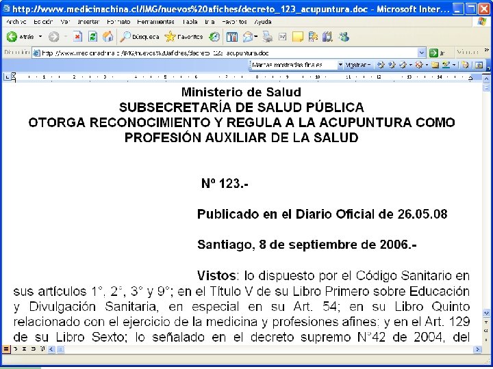 Necesidad de Reglamentación y Control l “Muchos elementos de la medicina tradicional son beneficiosos y la OMS anima y respalda a los países a fin de que identifiquen remedios y prácticas inocuos y eficaces para su utilización en los servicios de salud públicos y privados. La Organización ha hecho especial hincapié en la necesidad de apoyar la investigación sobre la acupuntura y su aplicación adecuada, y en 1991 la 44ª Asamblea Mundial de la Salud instó a los Estados Miembros a que introdujeran medidas para su reglamentación y control (resolución WHA 44. 34). ”(*) OMS/EDM/TRM/99. 1 / Directrices sobre capacitación básica y seguridad en la acupuntura