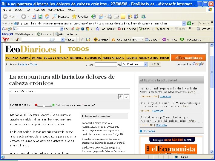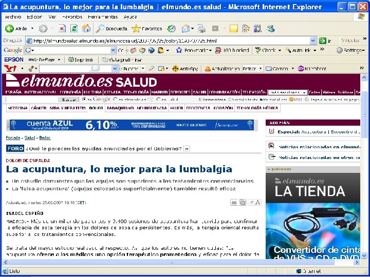 POTENCIAL PROMETEDOR l l Las medicinas con base de hierbas y la acupuntura son las terapias de la MT/MCA más ampliamente utilizadas. Los informes de las investigaciones de su eficacia clínica se han publicado en prestigiosas revistas científicas. La eficacia de la acupuntura para aliviar el dolor y las nauseas, por ejemplo, se ha demostrado concluyentemente y en la actualidad está reconocido mundialmente. Respecto a las terapias sin medicación, la serie British Medical Journal de 1999 comentó sobre la MCA que los ensayos aleatorios controlados han proporcionado una buena evidencia que tanto la hipnosis como las técnicas de relajación pueden reducir la ansiedad, y prevenir los trastornos provocados por el pánico y el insomnio. Los ensayos aleatorios también han demostrado que la hipnosis es una técnica valiosa para el tratamiento del asma y del síndrome de intestinos irritables, el yoga es beneficioso para el asma y el tai ji ayuda a las personas ancianas a reducir el miedo a caerse.