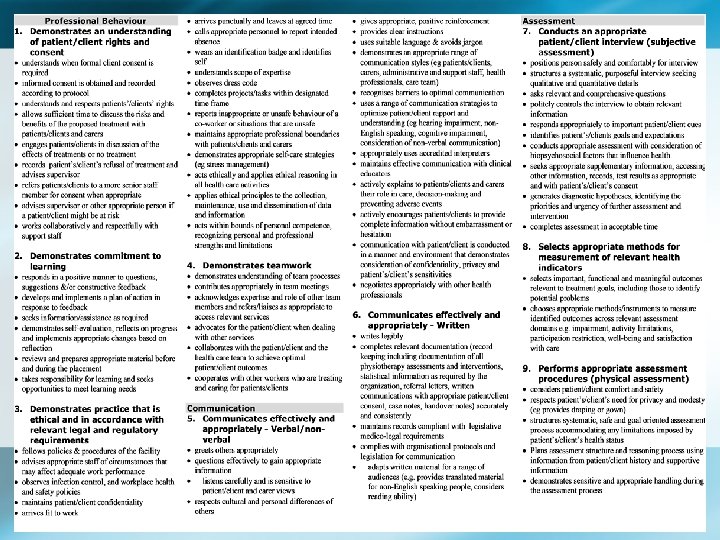Passing Standard/Entry Level Description • Employable • Able to carry a case load of basic patients with some supervision • Measure their own outcomes • Maintain safety • Write notes legibly, accurately • work independently and with a team • Ask questions know their limitations