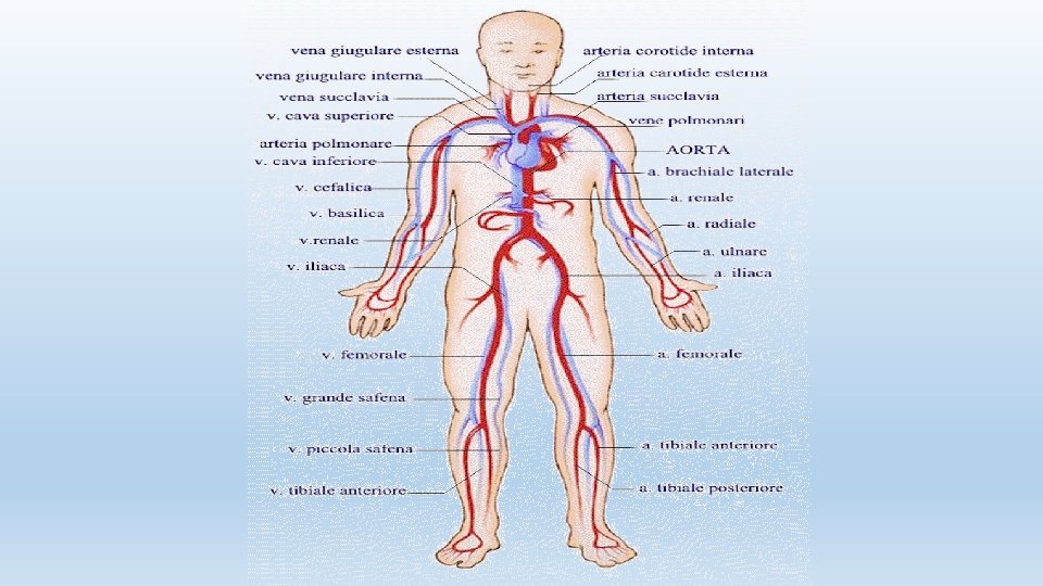 I VASI PRINCIPALI • Dal ventricolo sinistro del cuore si dirama la più grande arteria: l´aorta. Essa ha una prima porzione ascendente, forma poi un´ansa, da cui partono le arterie dirette agli arti superiori e al capo, dal tratto discendente partono i vasi diretti agli organi del tronco, e infine si divide nelle due arterie dirette agli arti inferiori. • All´atrio destro del cuore giungono col sangue refluo dalla circolazione sistemica le vene cave superiore ed inferiore. Nella vena cava superiore confluiscono le vene provenienti dagli arti superiori e dal capo. Nella vena cava inferiore giungono tutte le vene del tronco e degli arti inferiori. Dal ventricolo destro parte il tronco polmonare che si dirama ben presto nelle due arterie polmonari destra e sinistra recando ai polmoni sangue deossigenato. • All´atrio sinistro del cuore giunge il sangue ossigenato grazie alle vene polmonari.