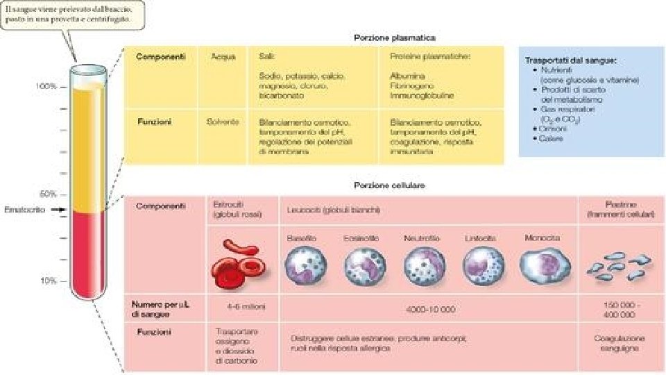 Le funzioni del sangue Le sue funzioni principali sono: • trasportare l’ossigeno dai polmoni alle cellule; • trasportare l’anidride carbonica ai polmoni perché la espellano • trasportare le sostanze nutritive • trasportare le sostanze di rifiuto (come l’urea), dai tessuti ai reni per farle espellere • trasportare acqua e sali minerali ovunque siano necessari • mantenere costante la temperatura del corpo • trasportare gli ormoni che regolano varie funzioni dell’organismo • difendere il corpo dai microbi, grazie all’azione dei globuli bianchi • rendere possibile la coagulazione del sangue in caso di ferite o escoriazioni del nostro corpo, grazie all’azione delle piastrine