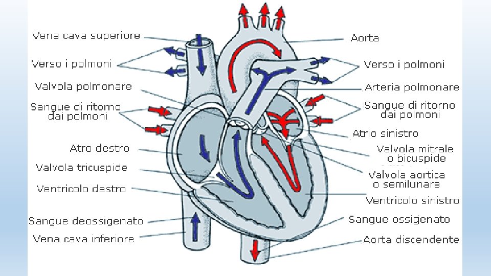 • Nell’apparato circolatorio si distinguono una piccola circolazione: che inizia nel ventricolo destro e porta ai polmoni il sangue venoso ricco di anidride carbonica, attraverso l’arteria polmonare. Nei polmoni avviene lo scambio gassoso e il sangue arterioso ricco di ossigeno torna all’atrio sinistro del cuore, attraverso le vene polmonari. • La grande circolazione, invece, inizia nel ventricolo sinistro dove il sangue arterioso, ossigenato, passa nell’arteria aorta e da qui raggiunge le varie parti del corpo fino ai capillari dove avvengono gli scambi gassosi e di sostanze tra sangue e tessuti. Poi, attraverso le vene cave superiore e inferiore, il sangue, ricco di anidride carbonica, torna nell’atrio destro del cuore.