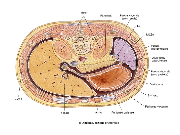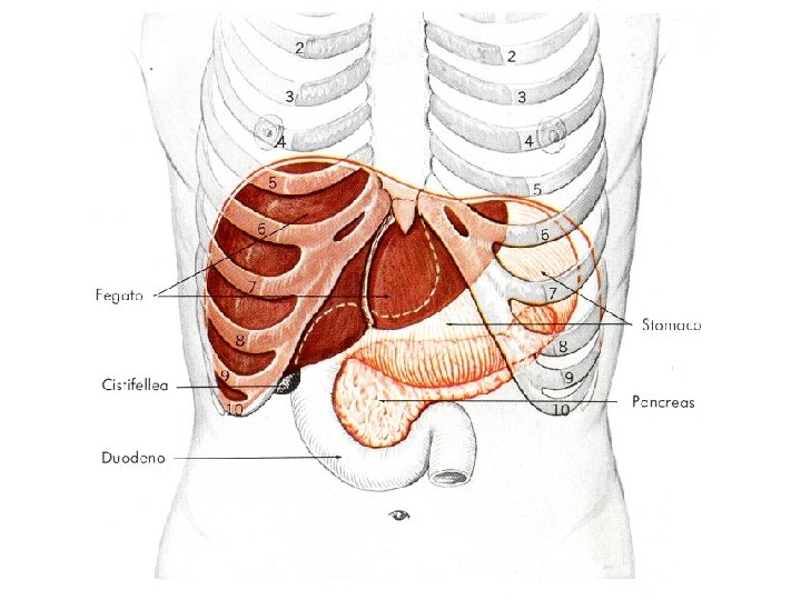 AREA NUDA Faccia diaframmatica STOMACO DUODENO Solco saggittale dx e sn Solco trasverso ILO RENE DX COLON Margine post tondeggiante Fossa cistica