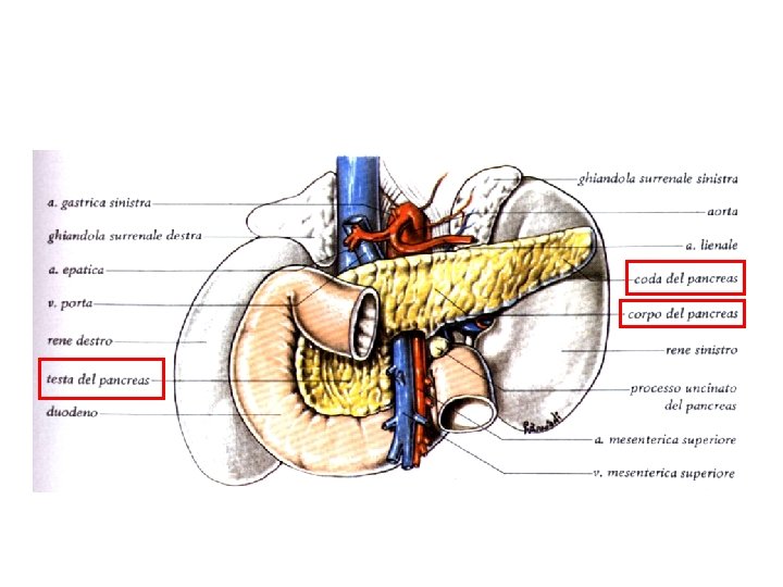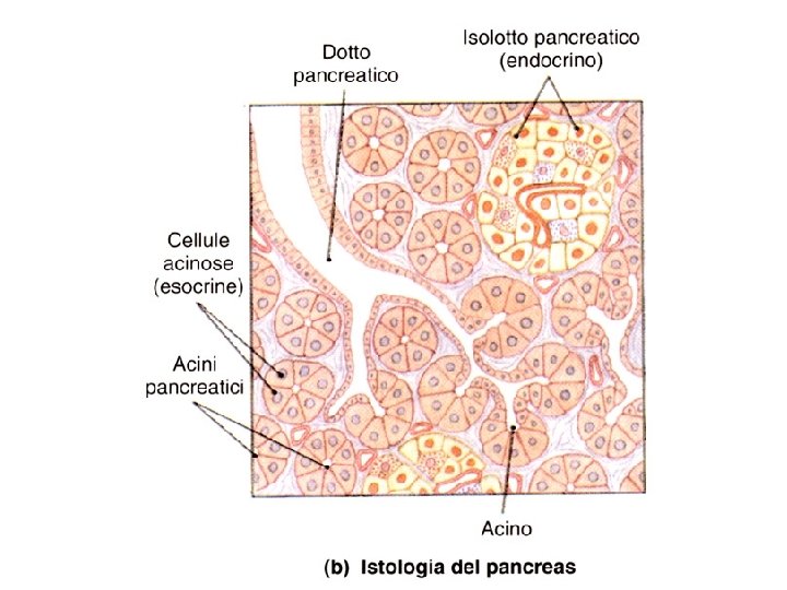 Pancreas: Ghiandola esocrina: maggior parte degli enzimi digestivi Ghiandola endocrina: ormoni (es. insulina e glucagone) Ghiandola esocrina: • Tubulo-acinosa ramificata a secrezione sierosa • Riversa il suo secreto nel Duodeno