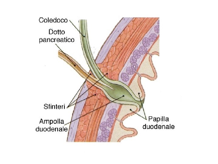 Condottini terminali (canali di Herring): alla periferia del lobulo epatico Dotti biliari interlobulari: negli spazi portali; parete costituita da cellule pavimentose -> cubiche.