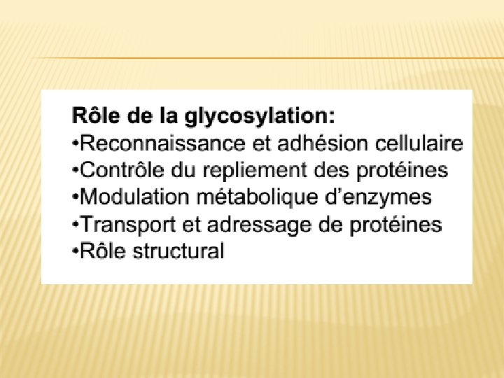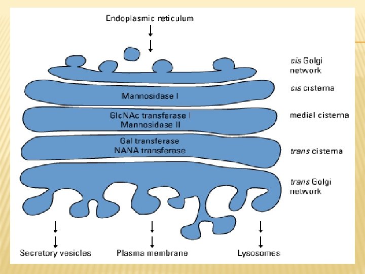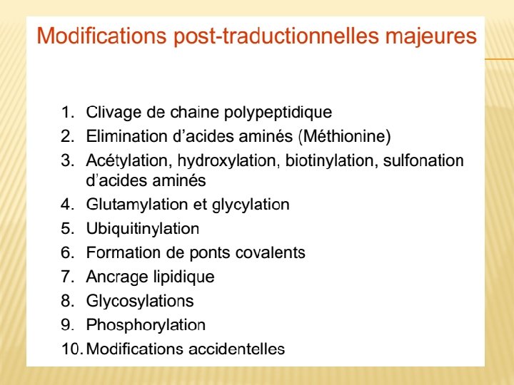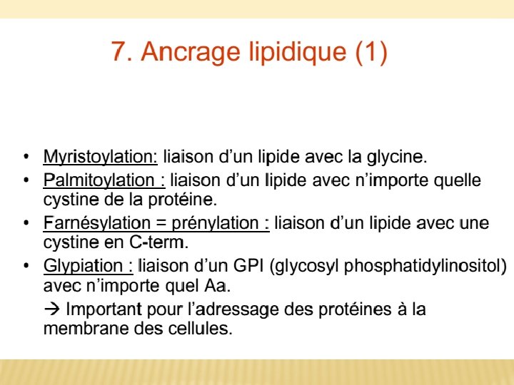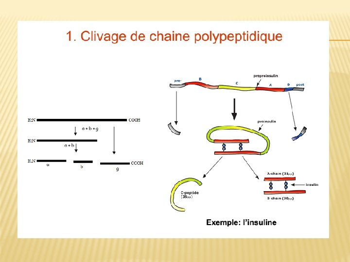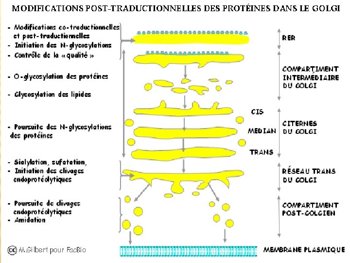 � 1 -Glycosylation des protéines � 2 -Glycosylation des lipides � 3 -Sulfatation des protéines (SO 4) � 4 -Coupures protéolytiques: Les coupures protéolytiques sont initiées dans le trans Golgi et se poursuivent dans les grains de sécrétion du compartiment post-golgien, pour devenir protéines actives.