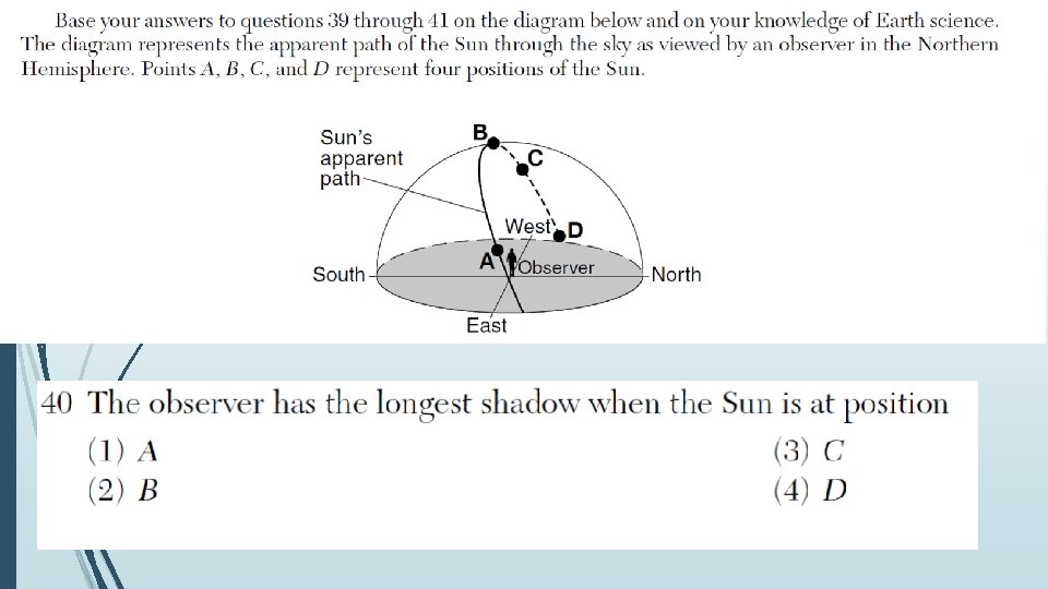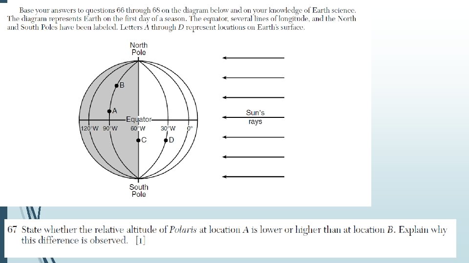 To calculate the height of the sun at local noon… Equinoxes: solar altitude at noon = 90° - latitude = 90° - 43° = 47° above horizon at local noon Summer solstice = 90° - latitude + 23. 5° = 70. 5° Winter solstice = 90° - latitude - 23. 5° = 23. 5°