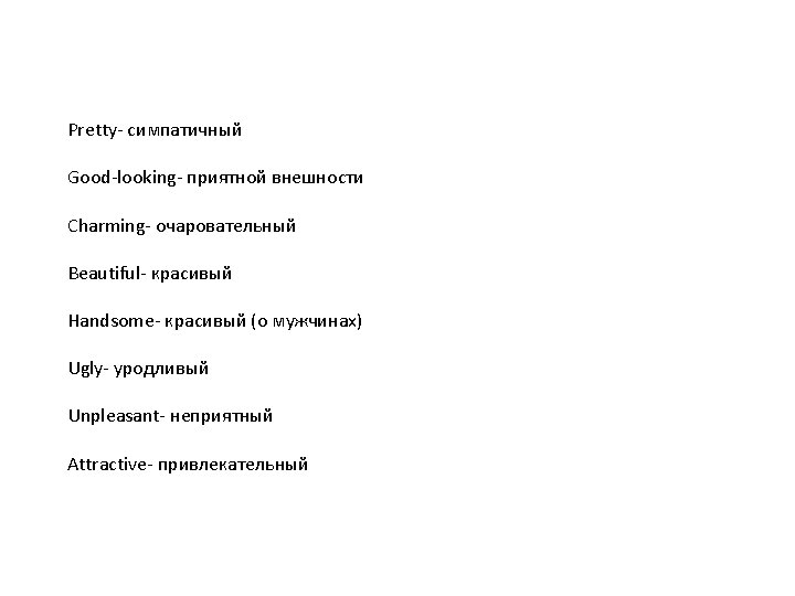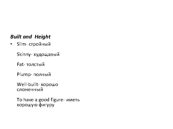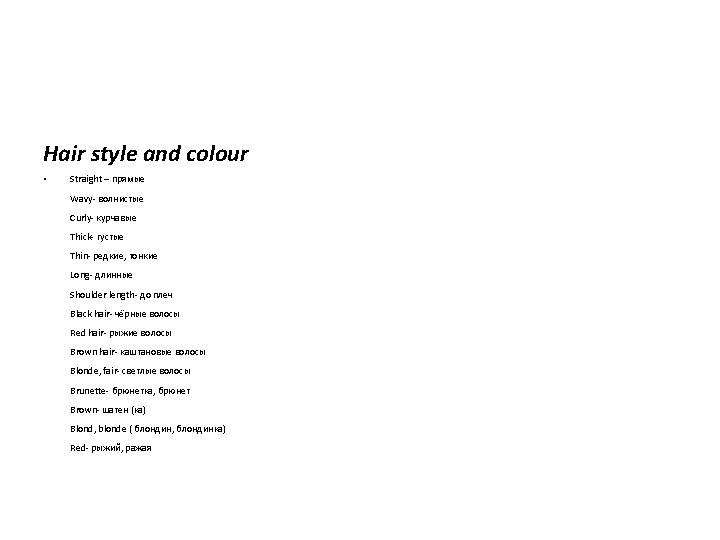 He /she is • • • • Young slim, well- built Hazel-eyed in his/her 30’ pretty good-looking Charming- очаровательный Beautiful- красивый Handsome- красивый (about men) Ugly- уродливый Unpleasant- неприятный Attractivemiddle-aged He /she has • • • beauty spot long eyelashes bushy eyelashes Blue eyes Grey eyes Brown eyes Narrow eyes Wavy, long hair a good figure