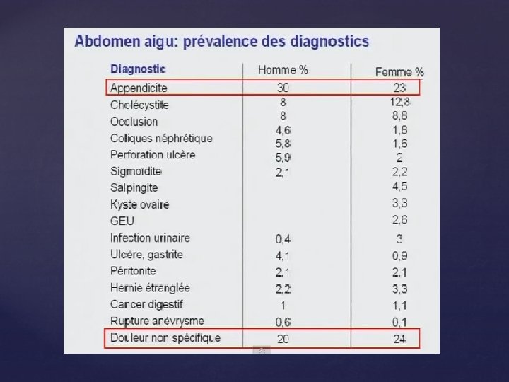 Diagnostic Scores clinico-biologiques (NFS, BU +/- b. HCG): Score de FRANCOIS: Signes en faveur: Signes en défaveur: • Sexe masculin +2 • Sexe féminin -1 • Age > 50 ans +3 • Age 20 à 39 ans -1 • Durée des symptômes 3 jours ou plus -3 -3 -3 • Durée des symptômes 36 h 48 h +2 +1 • Défense +3 • Masse rectale droite • Pas de défense • Leucocytose > 13. 000 +2 • Leucocytose < 10. 000 -3 • Signes génito-urinaires -3