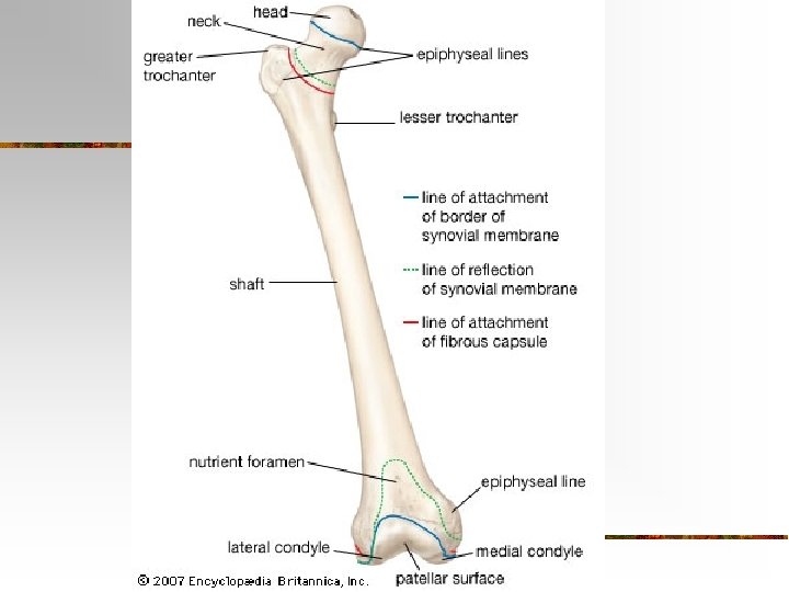 Femur continued n n n Body - diaphysis Head – “ball” of ball and socket joint Neck – common site of fractures Greater and Lesser Trochanters – used for muscle attachment Lateral and Medial Condyles – articulation with the tibia Patellar Surface