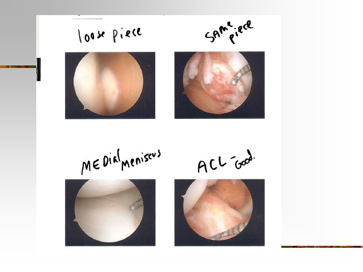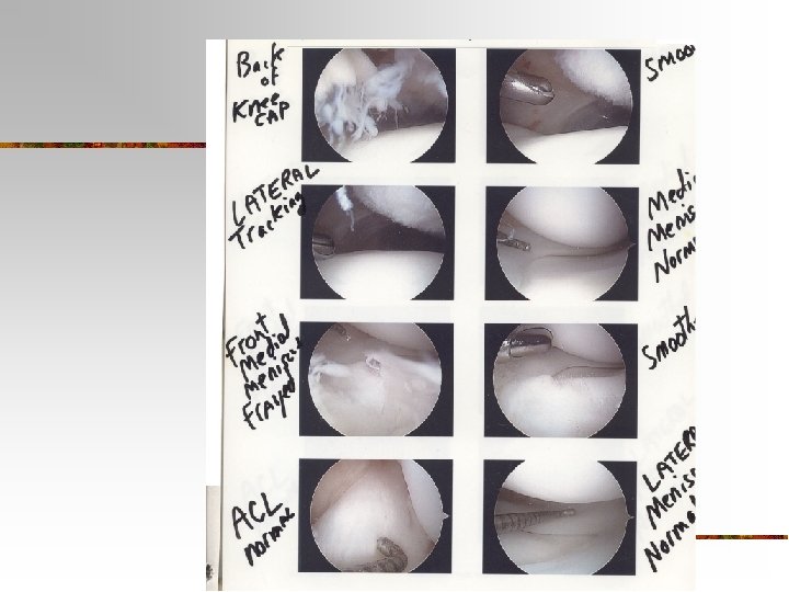 Torn Meniscus n The tearing of the cartilage in the knee is common among athletes. Damaged cartilage can wear away the joint and eventually develop into arthritis. The surgical repair of the knee may be assisted by arthroscopy (a small lighted tool is inserted into the knee for visualization)