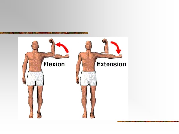 Flexion/Extension n n Flexion - A decrease in the angle between articulating bones Extension – An increase in the angle between articulating bones Found in hinge, pivot, condyloid, saddle and ball-and-socket joints HYPEREXTENSION – extension beyond anatomical position