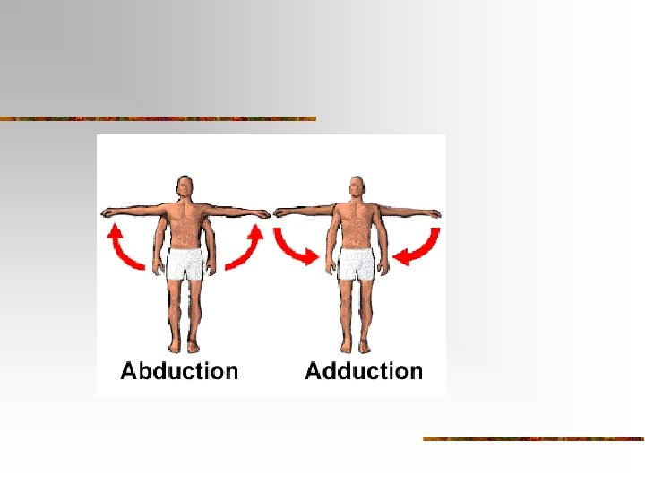 Abduction/Adduction n Abduction – movement away from the midline of the body Adduction – movement toward the midline of the body Found at condyloid, saddle and ball and socket joints