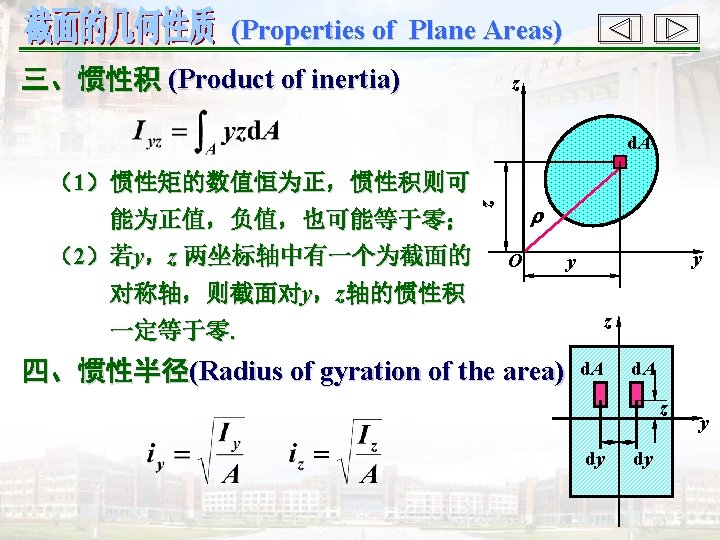 (Properties of Plane Areas) § 1 -2 极惯性矩、惯性积 (Polar moment of inertia、Moment of z inertia、Product of inertia) 一、惯性矩(Moment of inertia) z d. A O 二、极惯性矩 (Polar moment of inertia) 所以 y y