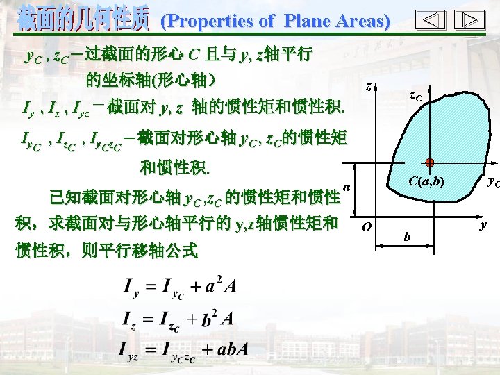 (Properties of Plane Areas) § 1 -3 平行移轴公式 (Parallel-axis theorem) 一、平行移轴公式(Parallel-Axis theorem for moment of inertia) z y, z  ̄ 任意一对坐标轴 C ―截面形心 (a , b ) ―形心C在 y. Oz坐标系下的坐标 C(a, b) a O b y